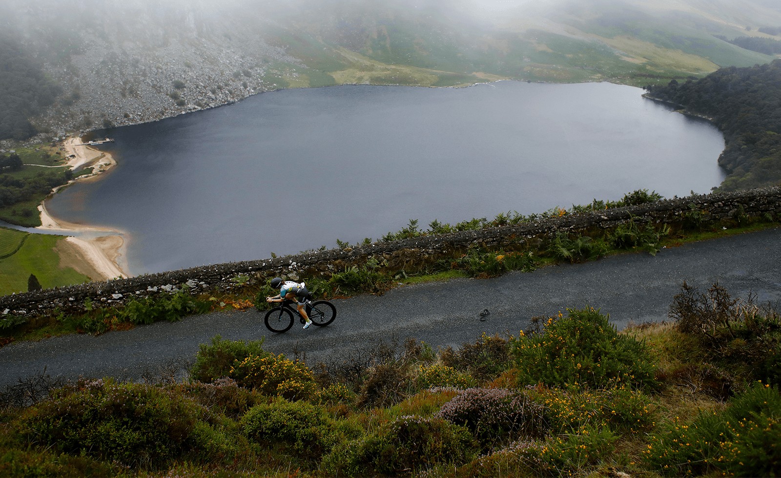 Following the swim, athletes transitioned onto a demanding 90 kilometre bike course that headed south into the Wicklow Mountains and across Sally Gap with scenic views of Lough Tay.